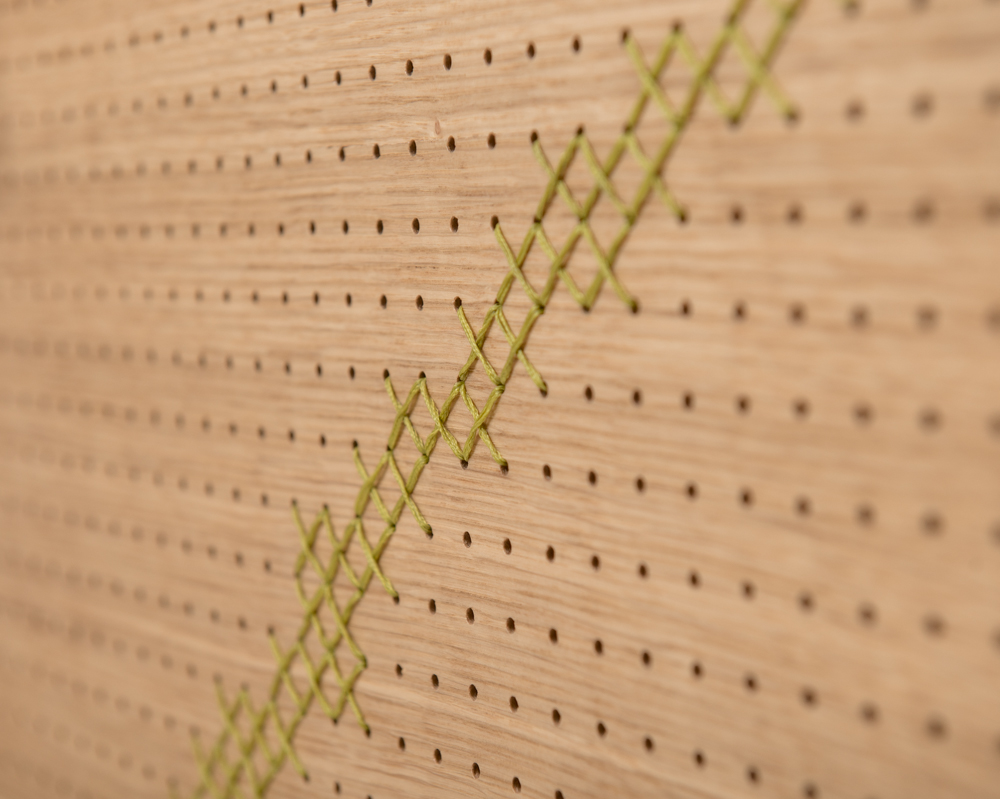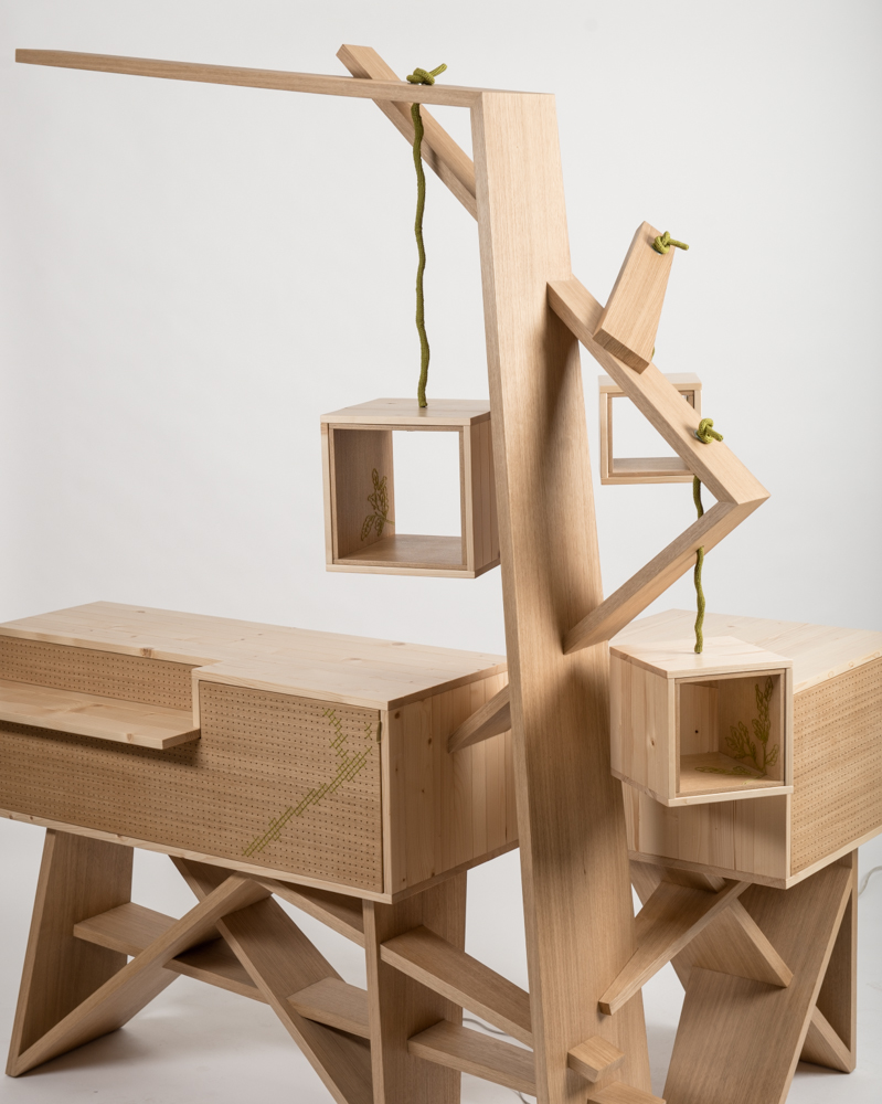 Comptoir de vente pour une boutique de créateurs. Ce meuble nous invite à questionner notre rapport à l’environnement et à la matière souple et solide à la fois. Un projet qui marque le début de mes recherches autour du croisement des fibres animales et végétales. Technique mixte, alliant savoir-faire de la main et outils numériques.