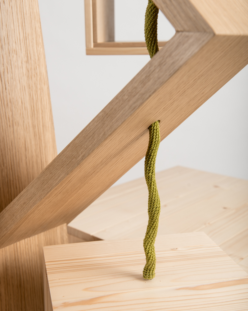 Sapin, contreplaqué, placage chêne et cordelette synthétique.