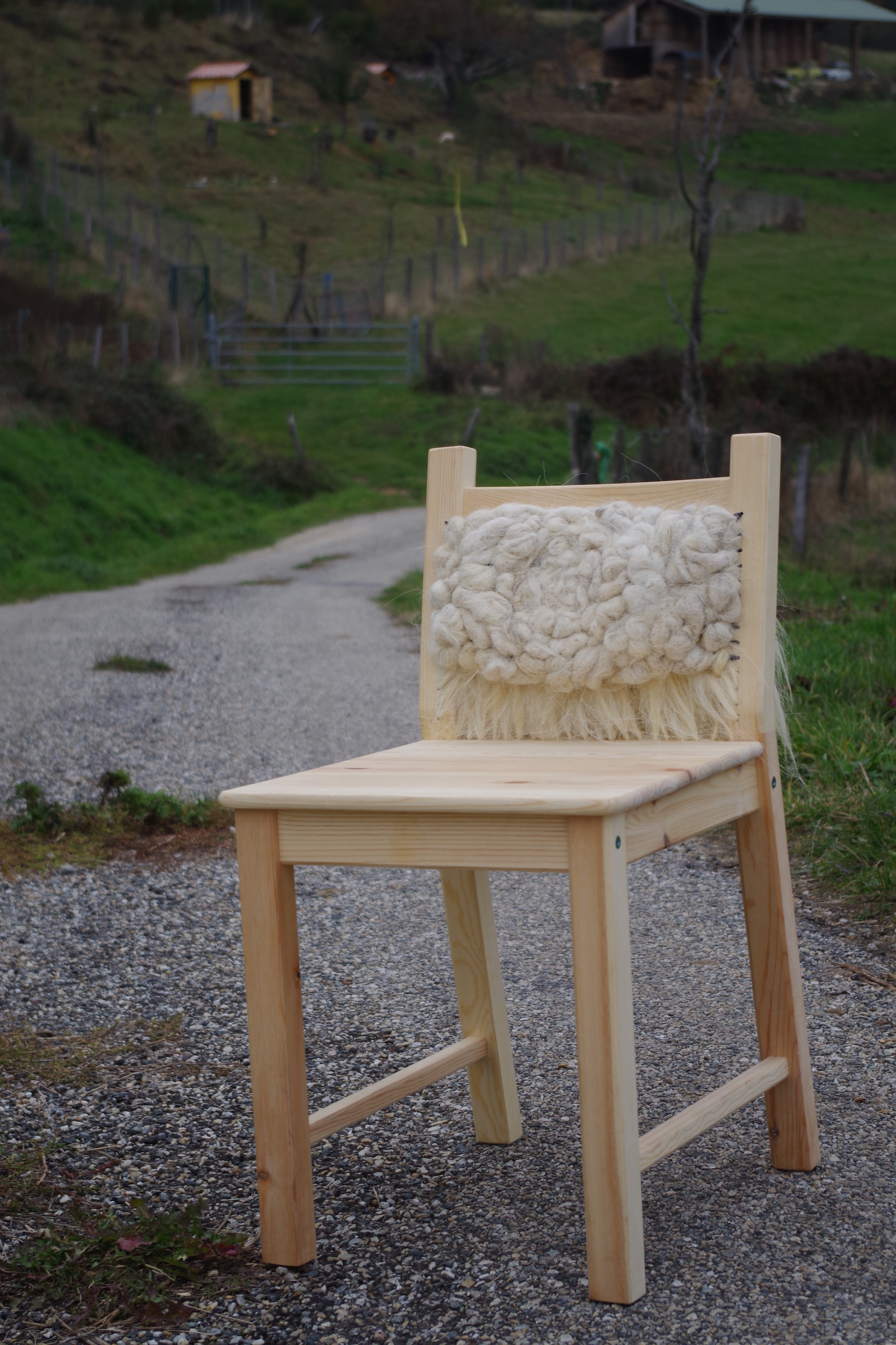 Laine brute, fil de coton et chaise IKEA.